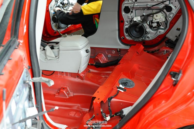 翼子板隔音能有效地降低路燥,胎噪的入侵。然后,我们把镜头转向车内的底盘隔音。