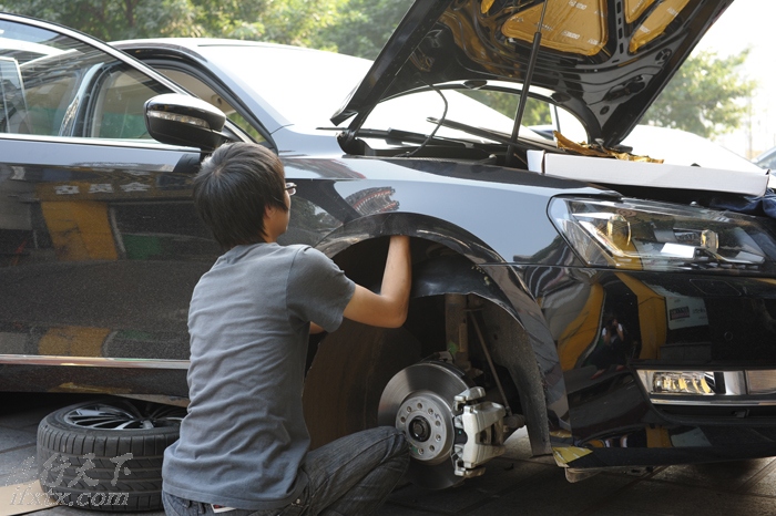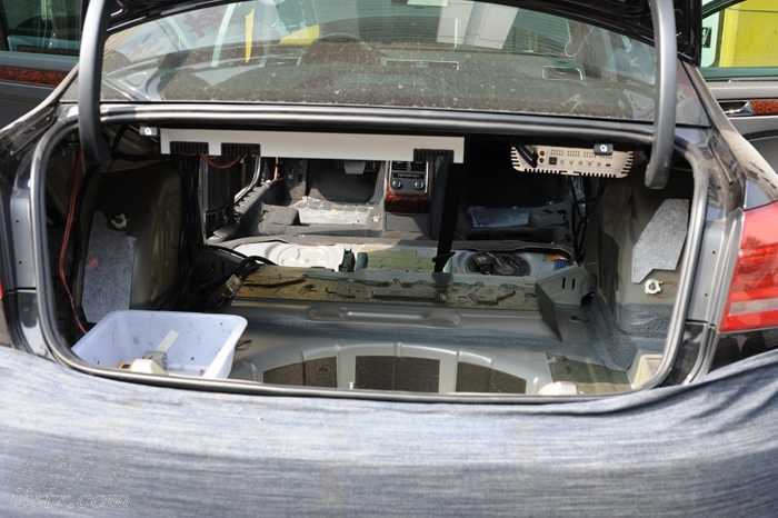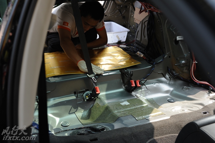 这是隔音必经过程,首先得把隔音各个部位装饰块等拆卸下来(如:四门隔音需要将门板拆下;底盘隔音需要将座椅、地毯全部拆下;尾箱隔音需要将尾箱的备胎、装饰块全部拆下;等等),才能粘贴隔音材料。技师们轻车熟路地将整车都拆卸一空!