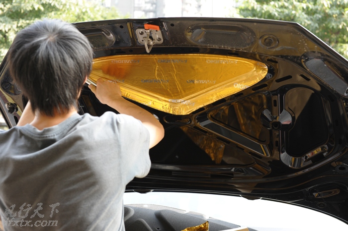 接下来就是针对各个部位粘贴萨迪隔音材料了,技师们分工协作,效率极高!