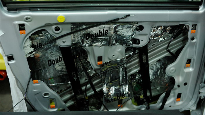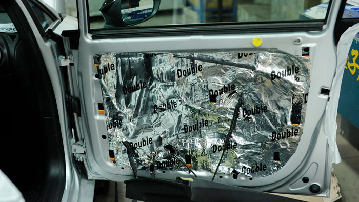 四门隔音,为了达到更好的隔音减震效果,所以里层、外层都要进行隔音,双层隔音,双管齐下。双层隔音,不仅能阻隔风噪、路噪等,最主要的是它能给喇叭提供一个良好的工作环境,阻隔共振,让车门形成一个密闭的箱体,杜绝“声短路”,让喇叭发挥出最好的声音。
