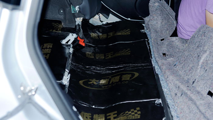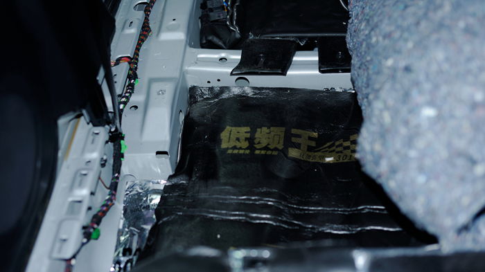 为了有更好的隔音效果,特地加了一层大能低频王。低频王独有的声学五层结构,使其在超低频段具有强大的 阻隔功能,是路噪和引擎噪音的超级克星,优异的隔热性, 可有效阻挡引擎、排气管向车内传导热量。作为大能汽车隔音的专利产品低频王拥有非常好的隔音效果,它使用在翼子板,车地板,后备箱这些位置阻挡低频噪音进入车内。