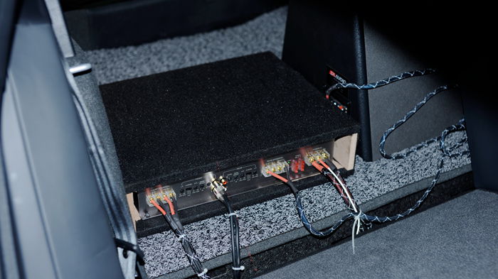 萨迪低音放在后备箱,在低音箱背面打上两条魔术贴,就能固定好低音箱。低音和功放并排安装在后备箱,就像一对好兄弟!