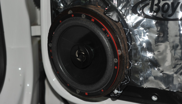 喇叭安装在原车喇叭处,在安装喇叭之前,技师们为喇叭加装喇叭垫圈,喇叭垫圈是经过防水处理的,这样既可以止振,又可以防水,在保证了喇叭更好表现的同时还保证了喇叭的使用寿命。