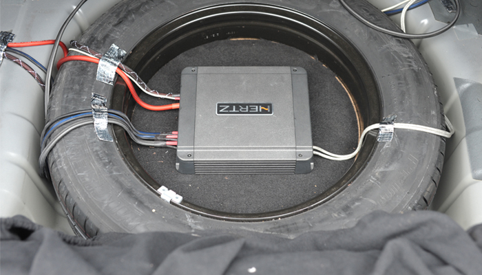 为了保证不占用太多的空间和保留备胎,将功放安装在备胎之中。