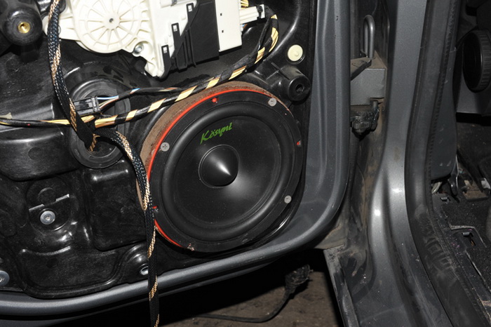 造成大众高尔夫原车品质较差的原因有两个:第一是因为原车音响系统材质太差;第二是因为原车的音响系统不够完善。重庆三正的改装技师就是从这两个方面来对汽车音响进行升级。前声场喇叭替换成了赫FCK165,它的音色要更加的自然一些,而且音乐的层次感也要更加的丰富一些。