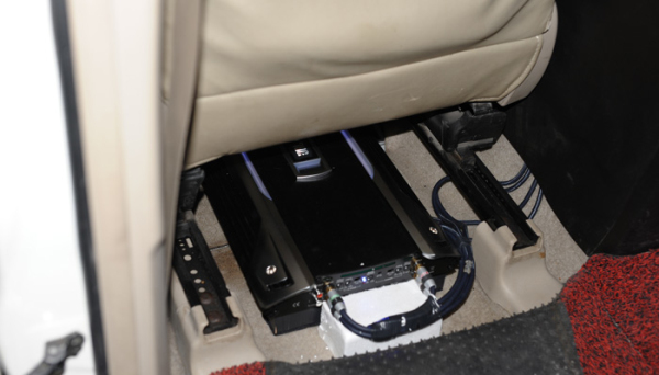由于功放比较长,放在后备箱或者其他地方要占很大的空间,从而就得不偿失,所以我们觉得把功放安装在主座位下面,进而不占车内空间,而且座位也能正常滑动,不影响座位功能。