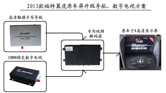 此次升级在不换原车屏幕的条件下,加装凯立德3D实景导航和CMMB数字电视,方案如下: