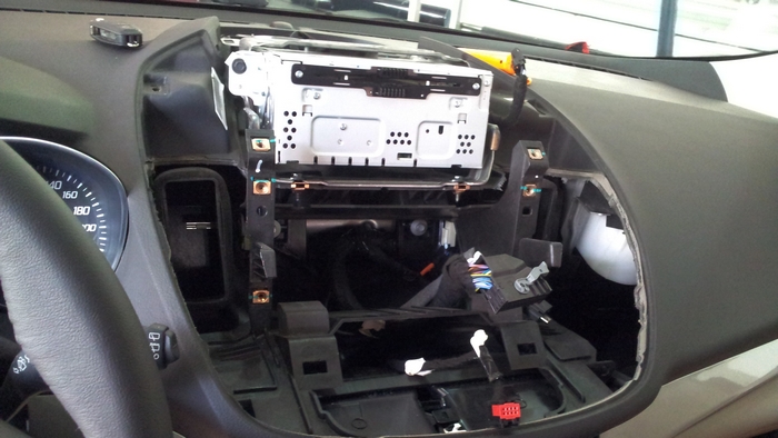 首先要拆开中控台顶部的塑料盖,这儿没螺丝,直接用撬板向上撬就可以了。拆下盖板之后可以看到LCD屏幕上方两边各有一颗螺丝,将这两颗螺丝拆除之后,就可以撬开屏幕外框(和空调出风口、音响控制面板是一体的)。