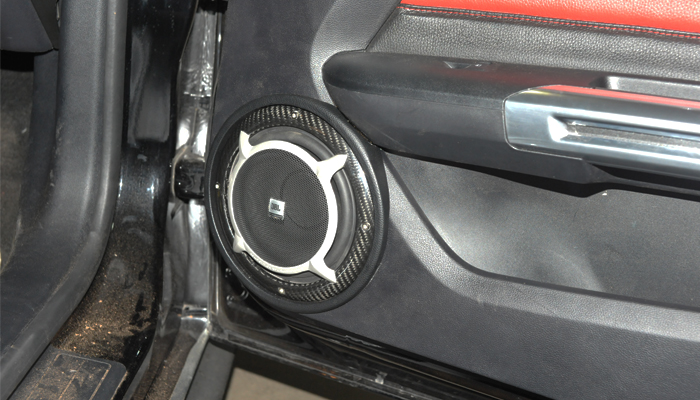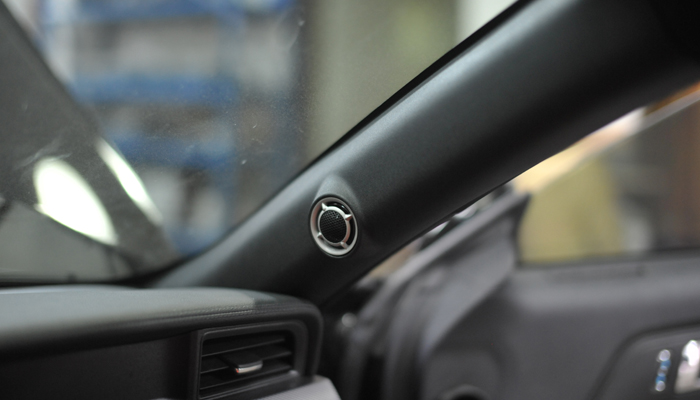 福特野马原车高音位于A柱上面,此次改装将高音直接安装在原车A柱高音位。