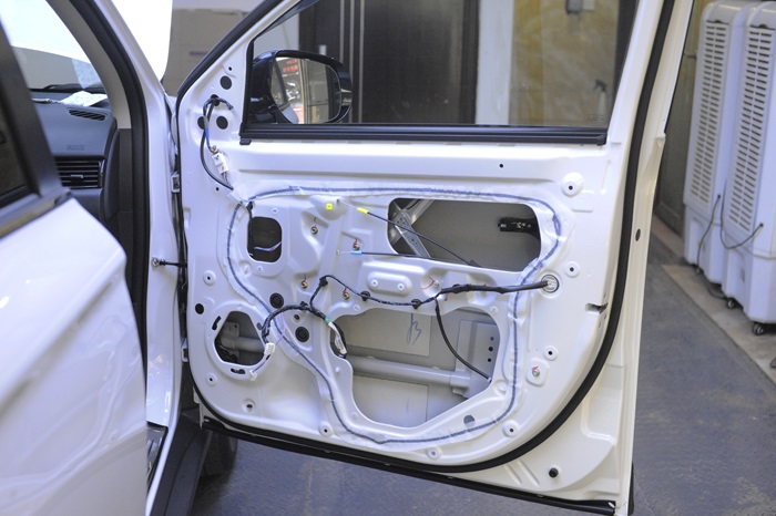 拆开门板可以看见原车门板隔音非常差,风噪大会影响到车内人员听歌效果。