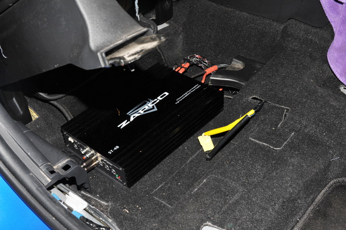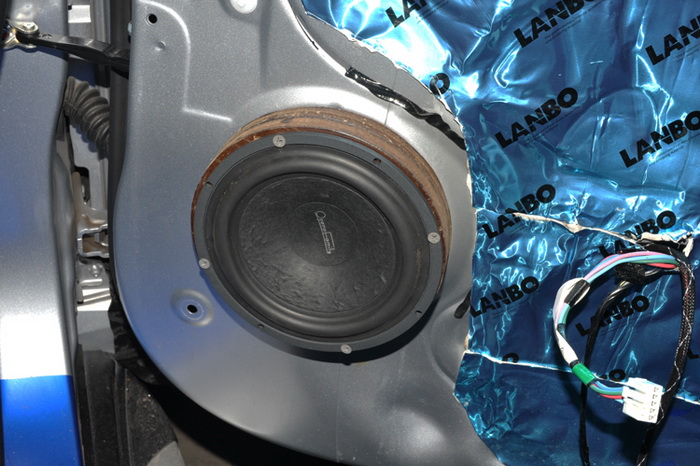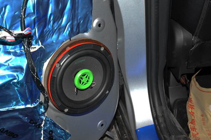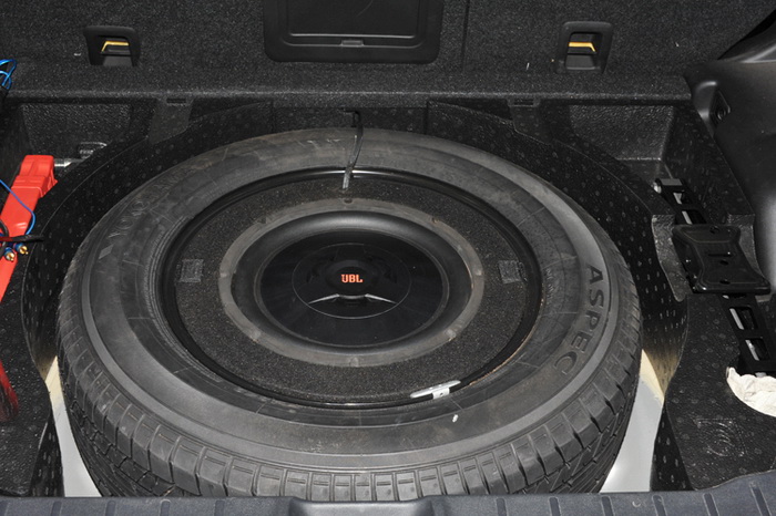 器材安装方面,以简约与实用的角度出发,喇叭都是安装在原位上,不过,值得一提的,装在门板喇叭的中低音喇叭加装了垫圈与防水罩,旨在让喇叭更好发音与固定,同时很好地保护喇叭使用寿命,功放引线装在座位底下,不占其他放物空间。更令车主意想不到的是,超低音采用倒模的安装方式,装在备用胎中央空位处,有效地利用原车资源,安装效果完全不影响备用胎取放,车主对整个设计方案及音响提升效果,都十分满意。