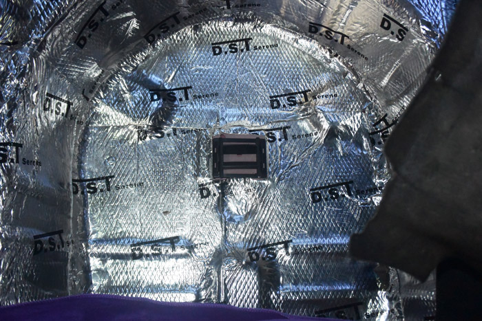 噪音主要来自机械共振产生的噪音和发动机噪音,高速行驶时外部的风噪声、路燥等,隔音方案采用第一层止振板铁在铁皮上提升强度,降低机械共振。第二层使用吸音棉吸收隔绝外部其他噪音。