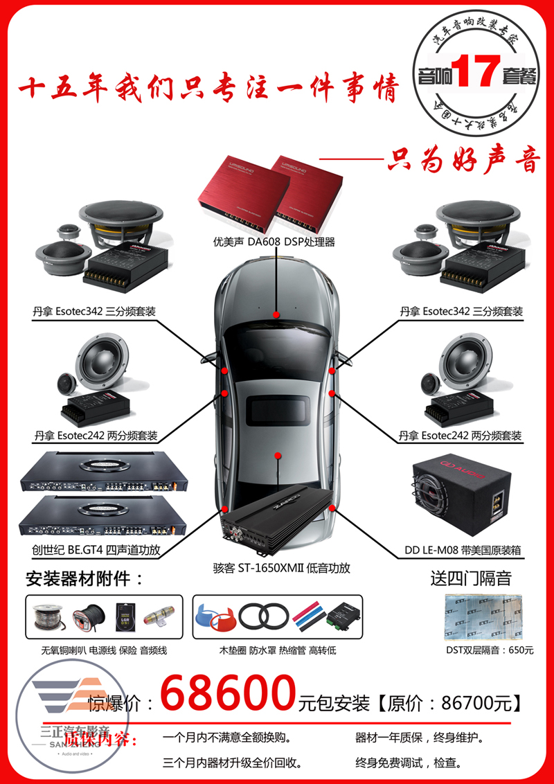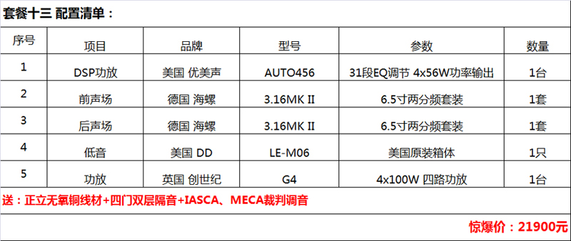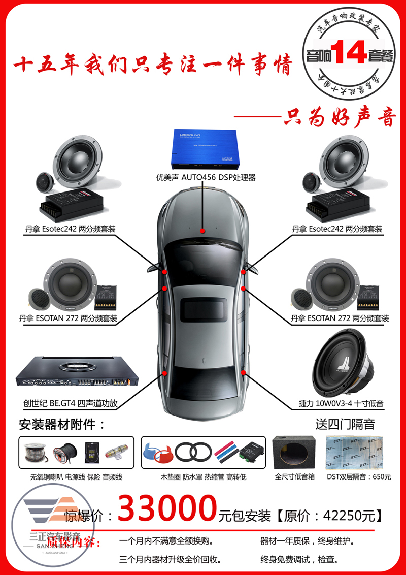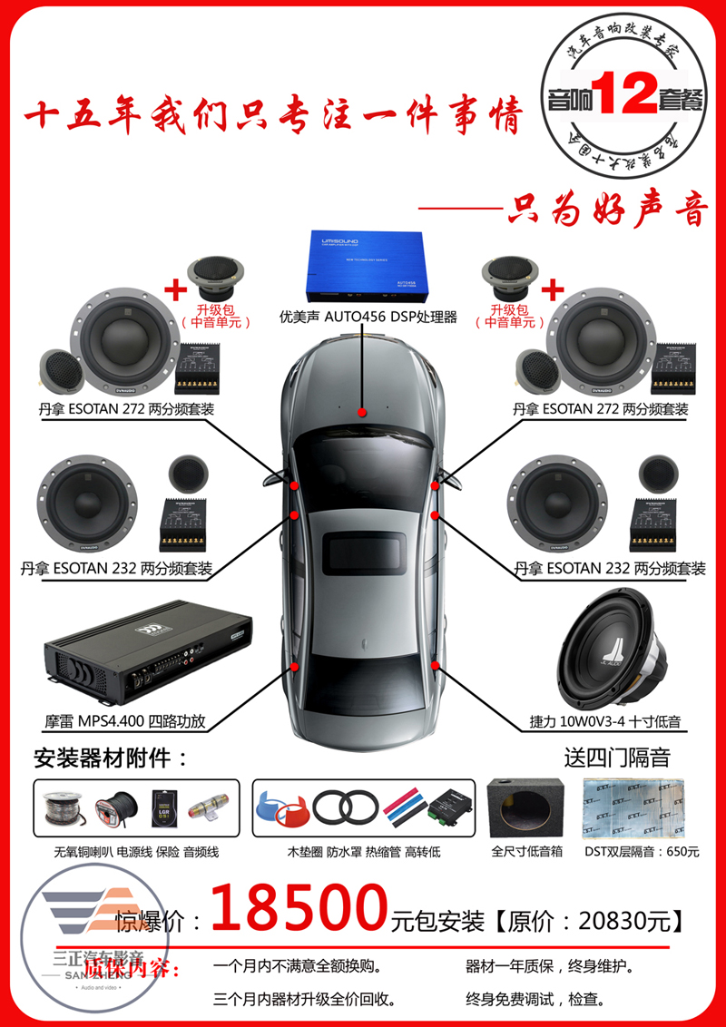 全新2019版音响改装方案震撼来袭,我们从音质效果、音乐风格、价格等各方面综合考虑,精心搭配出了十几款音响升级配置方案,有适合听流行音乐的,也有发烧人声的,还有综合类的,当然更少不了摇滚风格的。价格方面,从千元入门级的到万元级发烧的应有尽有,欢迎挑选,欢迎来店现场试听,总有一款适合您!