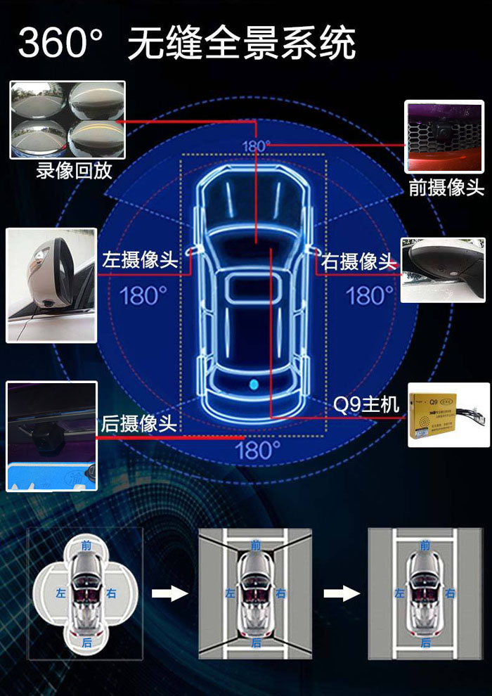 全景系统由前后左右4个摄像头组成,无缝拼接让周边图像无死角传输到主机。同时24小时全天候待机,周围发出声响或震动即可自动启动,进行四路录像。当录像U盘存满时,会自动删除最早的录像文件,腾出空间实时录像,保证关键时刻不会放过任何细节。
