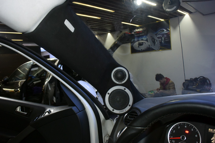 途观车主一直都是一位发烧友,很早以前就升级了音响,时间越久品味也越来越高,这次就将之前前声场升级的喇叭更换到后声场,前声场升级成丹拿ESOTAN 372三分频。
