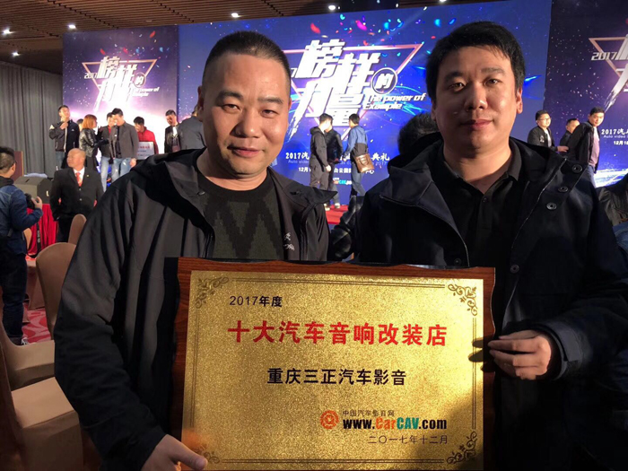 在激动人心的颁奖典礼上,重庆三正汽车音响凭借一直以来的努力和优异的行业表现,在全国几千家专业汽车音响改装店中脱颖而出,被评为“2017年度十大汽车音响改装店”,这已经是我店连续8年“2010-2017”荣获全国十大汽车音响改装店,这是对我们辛勤付出的认可。