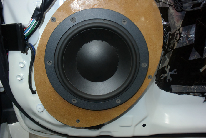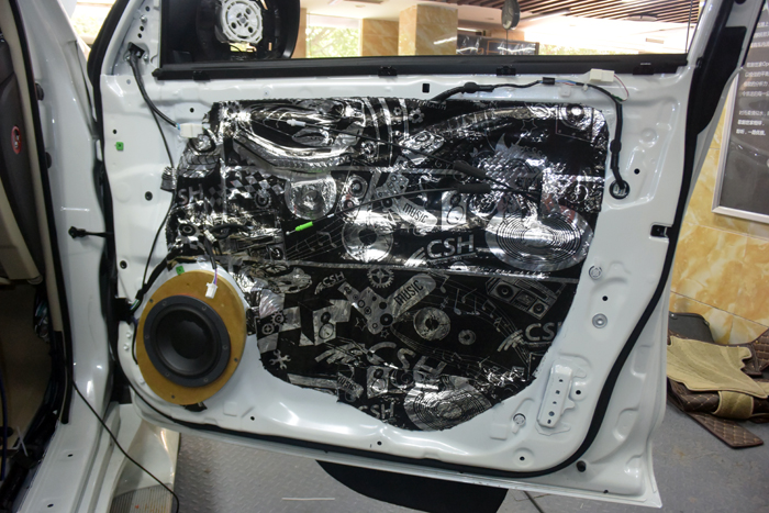 门板隔音可以起到一个隔音降噪的作用,增强钣金强度,抑制门板共振噪音。做好门板隔音以后音响中低频效果更好。前声场丹拿ESOTEC 242门板原位安装。