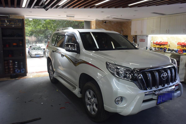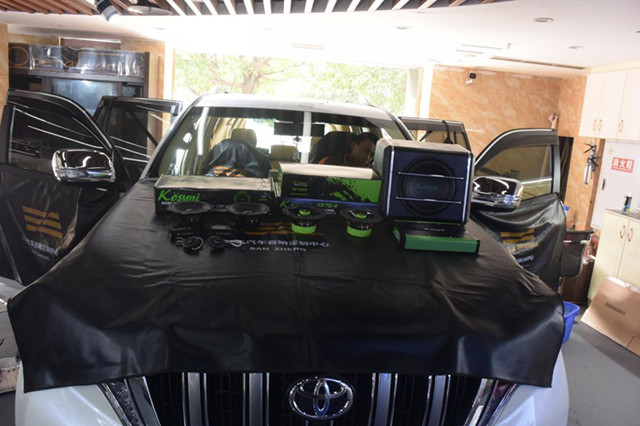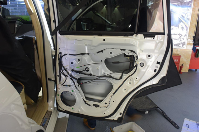 重庆三正的装师傅娴熟地将车门饰板拆下来,我们可以看到丰田普拉多原车基本没有隔音措施.