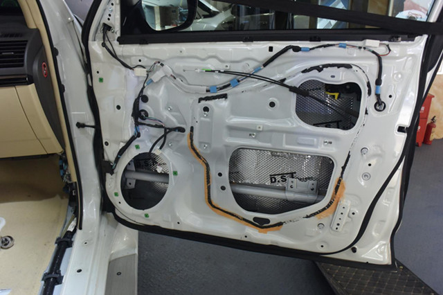 车门第一层隔音使用DST贴满,这样处理能有效阻止门板和外层钢板之间的共振噪音,对于止震隔热有着显著的作用。