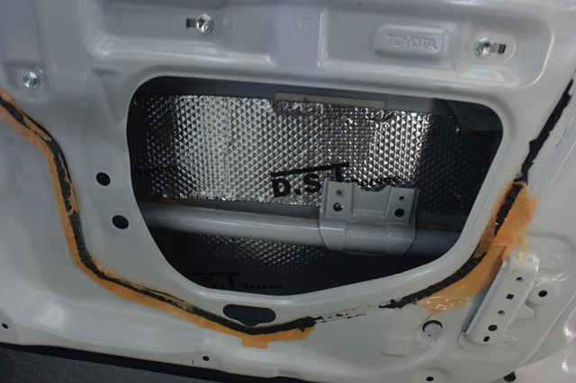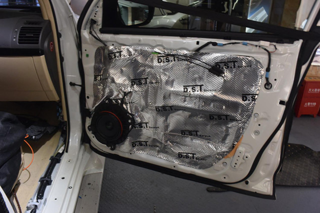 第二层采取贴一整张DST止震材料,这样不仅可以有效降低共振和风燥,同时会提升车门的密闭性,形成一个类似箱体的空间有效提升汽车音响效果的发挥。