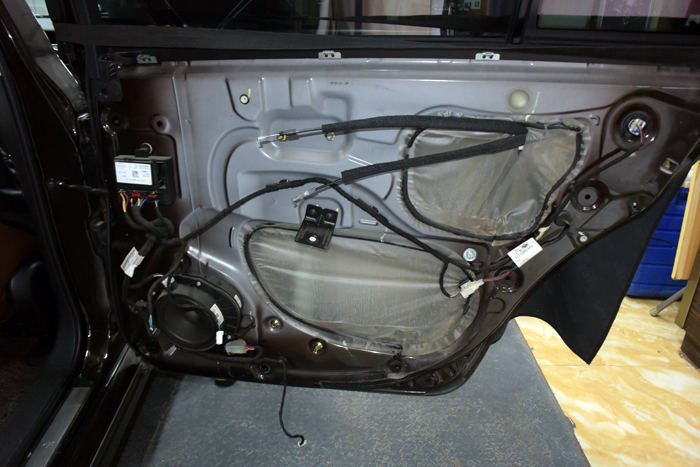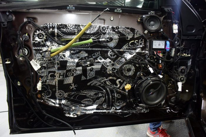 原车门板除了一层防水薄膜以外,是没有任何隔音止振措施。门板使用双层CSH银卫盾,CSH银卫盾是一款弹性非常好的防水材料,能紧密的贴合于复杂的安装面,提供良好的减振效果。