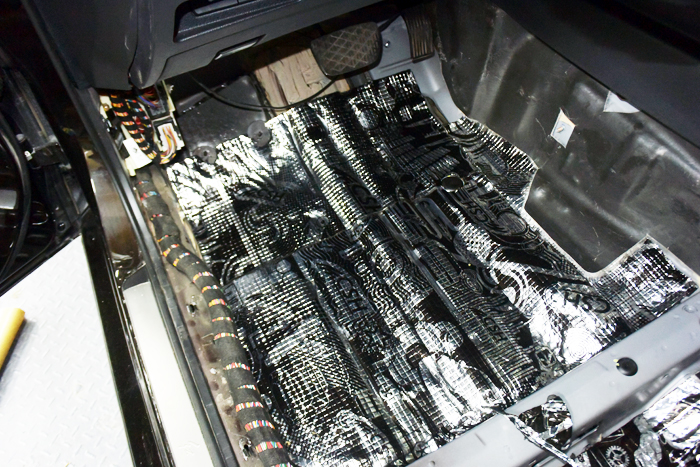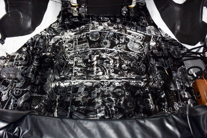 正负驾地板使用CSH小炸弹和CSH珍珠棉的组合,CSH小炸弹是一种多层减振材料,包含丁基橡胶聚合物层、铝箔外层。材料需安装于干燥的油漆表面,复杂表层同样适用。安装前应移除抗粘膜,从材料一边向另一边逐渐黏贴,然后用滚轮压实,避免产生气泡。