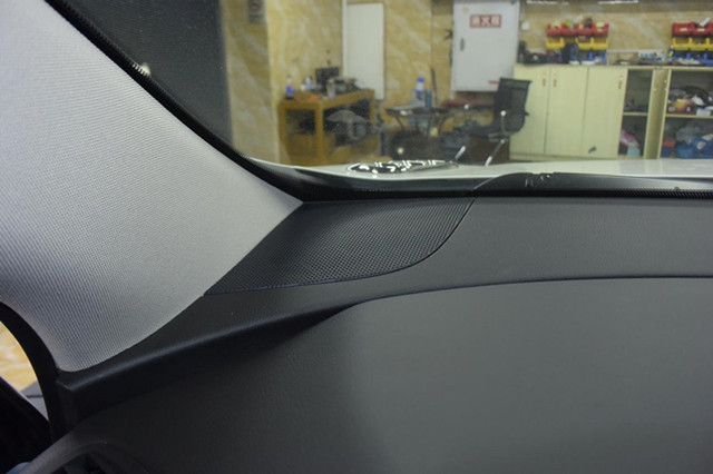高音安装在前挡风玻璃下面。将原车高音喇叭盖板原样安装回去,丝毫看不出有改装过的痕迹。
