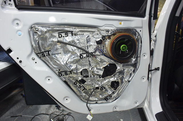现代名图的门板内部隔音效果不是很好,拆开门板饰盖之后可以会发现有很多空洞的地方,因此重庆三正的改装技师使用DST隔音材料对汽车门板做了内外双层的隔音处理。