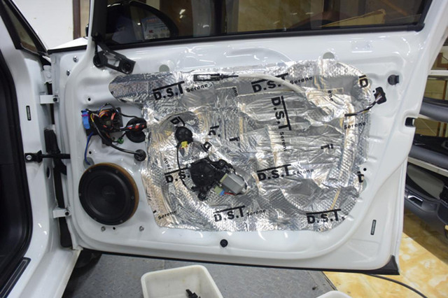 四门双层DST隔音可以把噪声降到最低,发才不会影响喇叭发出的音乐,必须门里和门板做减振,把门里的铁板的洞口封满, 把门里变成一个小箱体。