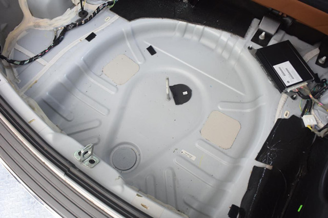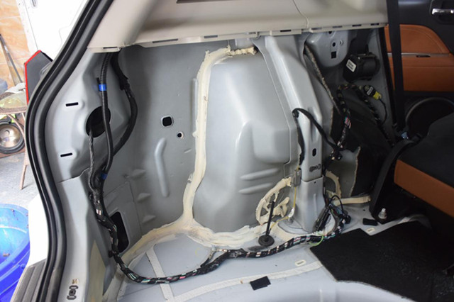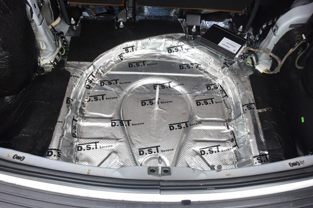 尾箱隔音:尾箱隔音需要将尾箱内的备胎、左右两侧装饰块等全部拆下。卸下装饰板 ,你会发现装饰板和车体之间没有任何衬垫。