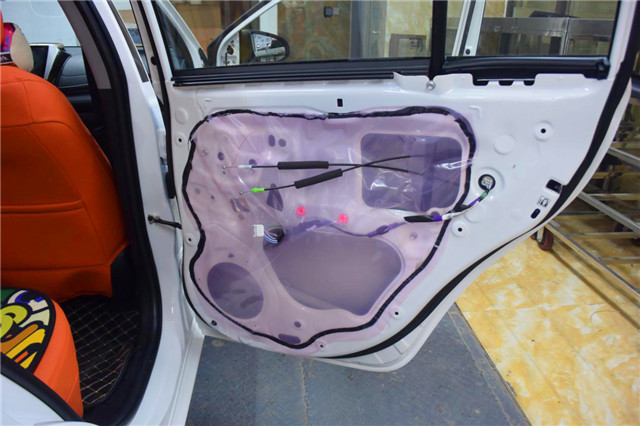 音响改装隔音先行,拆开原车门板可以看到,门板上只有一层防尘塑料,完全起不到多大的隔音作用。采用DST材料进行四门双层隔音。一方面更够降低风噪以及车门的异响振动,二是让车门形成一个扎实密封的箱体,这样喇叭安装在车门上才会有更好的音质效果。