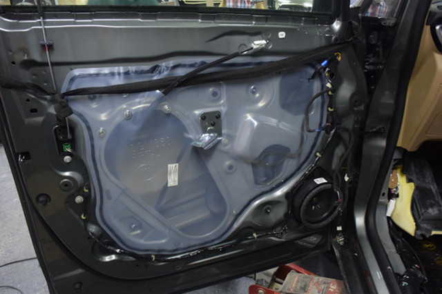 拆开门板后,可以看出原车基本没有什么隔音材料,只有一块防水胶皮隔着,只能起到防水的效果,对隔音而言基本没有什么太大作用,大量的风噪和路噪从其中传入车内,让车主的耳朵备受折磨。
